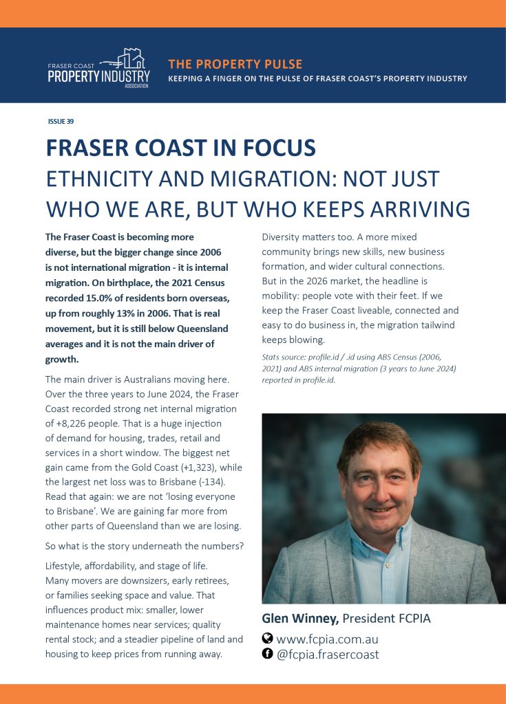 Diversity matters too. A more mixed community brings new skills, new business formation, and wider cultural connections. But in the 2026 market, the headline is mobility: people vote with their feet. If we keep the Fraser Coast liveable, connected and easy to do business in, the migration tailwind keeps blowing.
