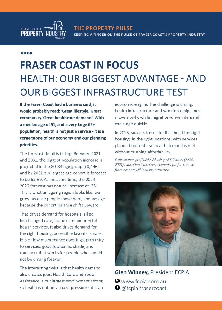 If the Fraser Coast had a business card, it would probably read: ‘Great lifestyle. Great community. Great healthcare demand.’ With a median age of 51, and a very large 65+ population, health is not just a service – it is a cornerstone of our economy and our planning priorities.