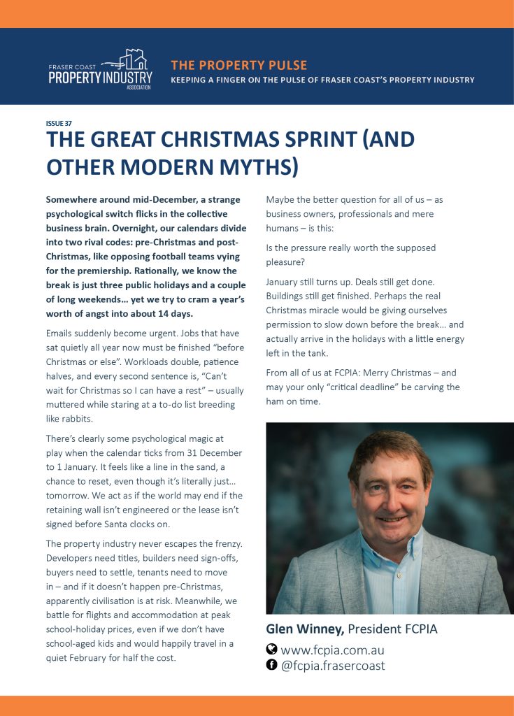 The property industry never escapes the frenzy. Developers need titles, builders need sign-offs, buyers need to settle, tenants need to move in – and if it doesn’t happen pre-Christmas, apparently civilisation is at risk. Meanwhile, we battle for flights and accommodation at peak school-holiday prices, even if we don’t have school-aged kids and would happily travel in a quiet February for half the cost.